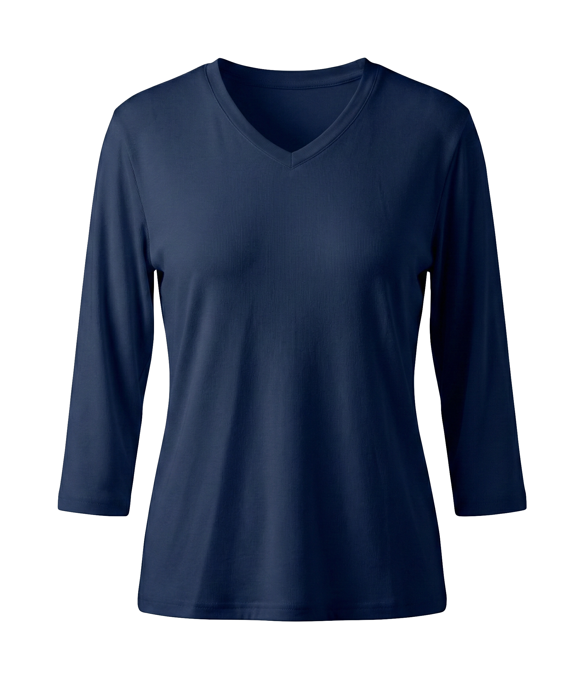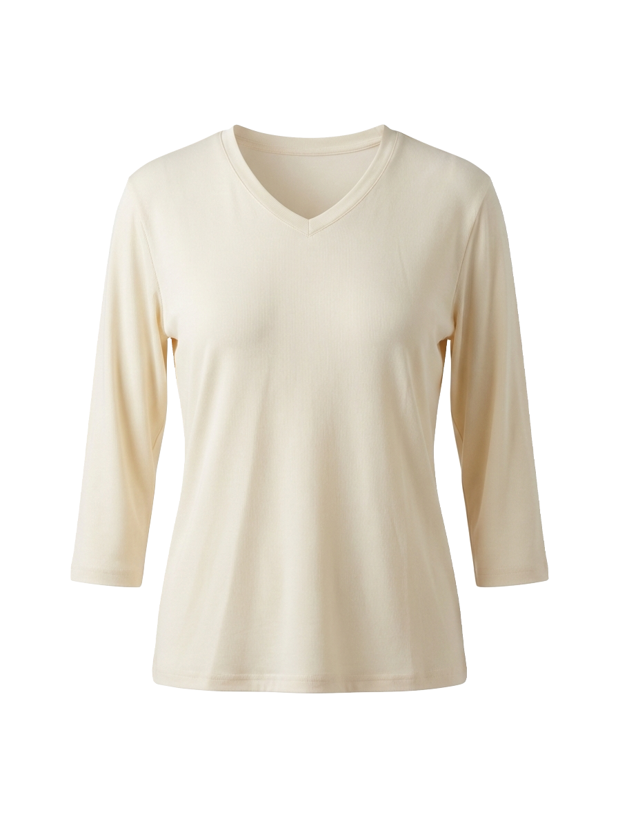 Maglia basica in tessuto fluido con manica 3/4 e scollo “V”.